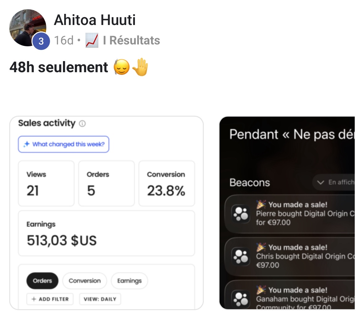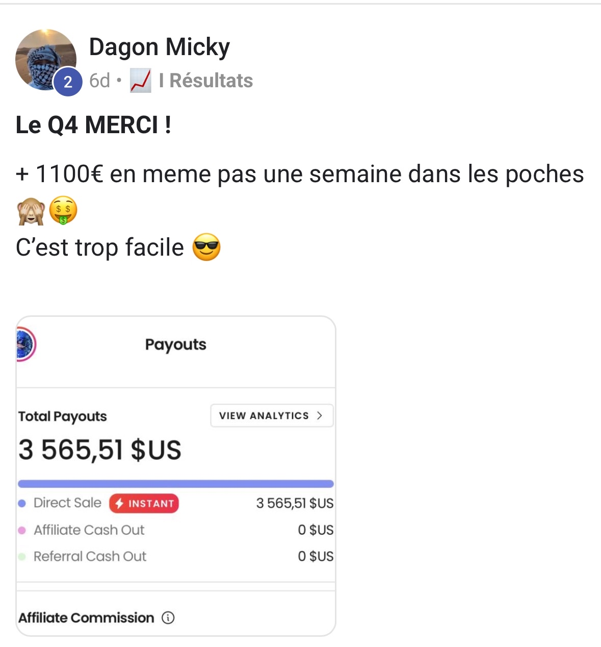 Il y a un mois, j’étais très craintif à l’idée de me lancer dans le business du marketing digital. J’avais beaucoup de doutes et de peurs, mais j’ai décidé de sauter le pas. Résultat : en seulement un mois, j’ai généré 1 650 €, et j’ai même réalisé mes premiers 200 € en seulement 24 heures. Comme quoi, oser se lancer peut vraiment tout changer.